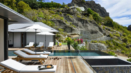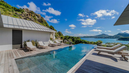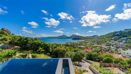 This magnificent property is nestled in the charming bay of Anse des Cayes, offering breathtaking views of the sea and the surrounding hills. This six-bedroom villa is ideal for a family or friends holiday, offering a luxurious and memorable setting. On two levels, the villa features large, bright spaces thanks to its many windows. On the upper floor, you will find a living room overlooking an infinity pool, surrounded by elegantly arranged sofas. The dining room for eight is adjacent to a fully equipped kitchen, while a second living room with HD TV offers an additional relaxation area. The floor-to-ceiling windows offer exquisite views of the ocean, to enjoy the gentle breeze of the trade winds. The terrace in front of the villa offers an idyllic view of the crystal clear waters and the green hills of St. Barts. The infinity pool is surrounded by comfortable lounge chairs, inviting relaxation and the lushness of the islands. A garden with a table and chairs offers a touch of plant freshness to the whole. Within the villa, you will find six air-conditioned bedrooms with king-size beds. Three of them are located on the main floor, with their own bathroom and access to the terrace. The other three bedrooms are located on the ground floor, with two connecting rooms sharing a bathroom, ideal for a family. The furnished terraces allow guests to enjoy the tropical climate at all hours. The refined decoration, quality materials and brightness of the villa create a serene and welcoming atmosphere. With its ideal location facing the ocean and the hills, this villa will allow you to live exceptional moments in the absolute luxury of the Caribbean.